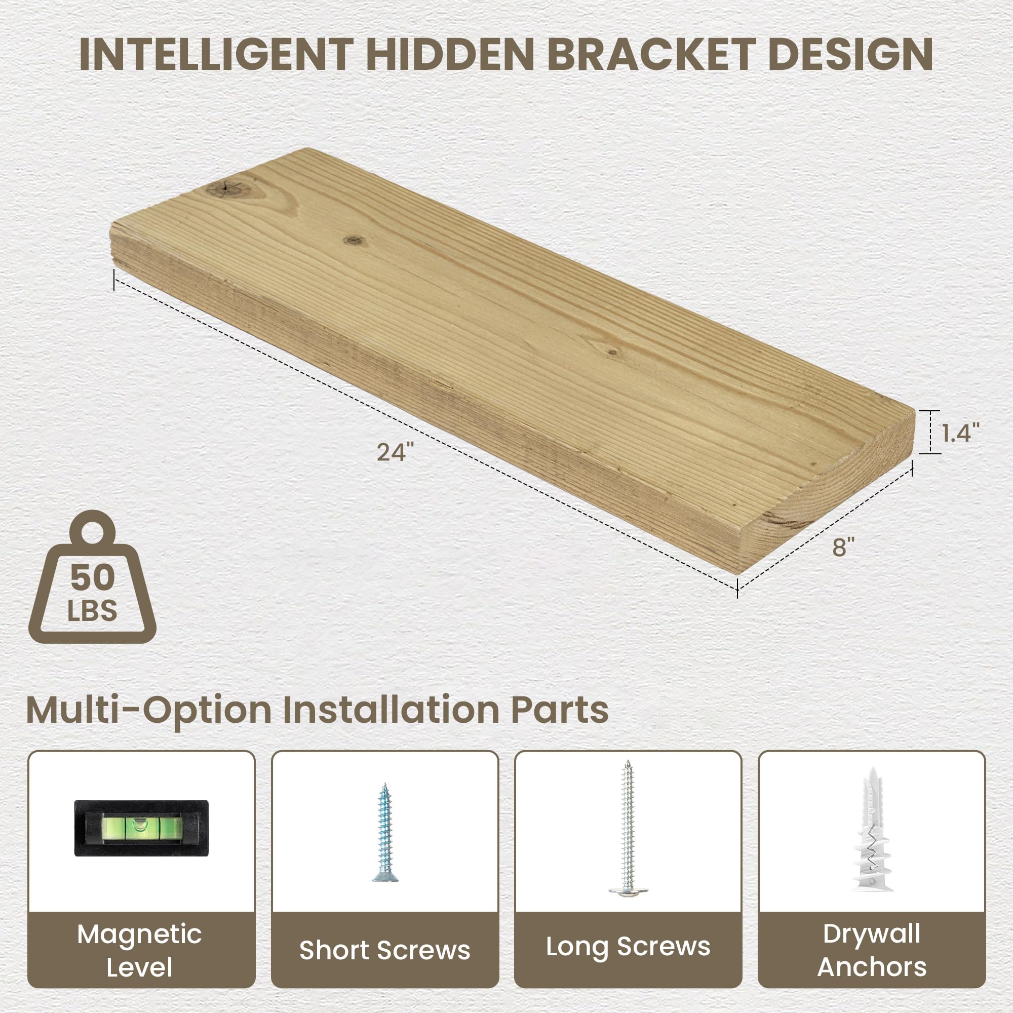 Acovy 8 INCH DEEP Rustic Reclaimed Barnwood Floating Shelves Wall Mounted, Wall Shelves with Invisible Bracket for Living Room, Bathroom, Bedroom and Kitchen, 24 Inch Width Set of 2, Natural