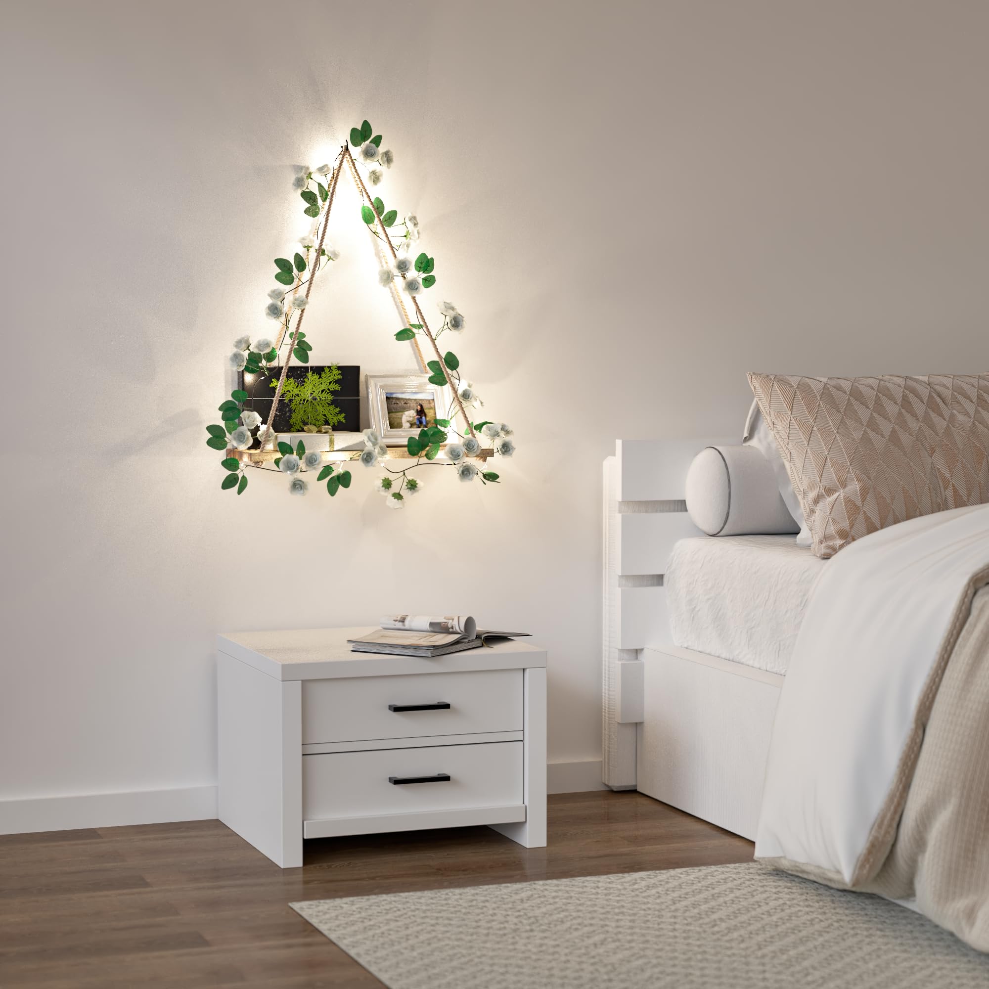 Triple Artificial White Flower Garland with LED-Strip Wall Hanging Shelves Set of 2, Boho Shelves for Wall Décor, Macrame Wall Shelf for Bedroom Bathroom Living Room Kitchen (No Battery Included)